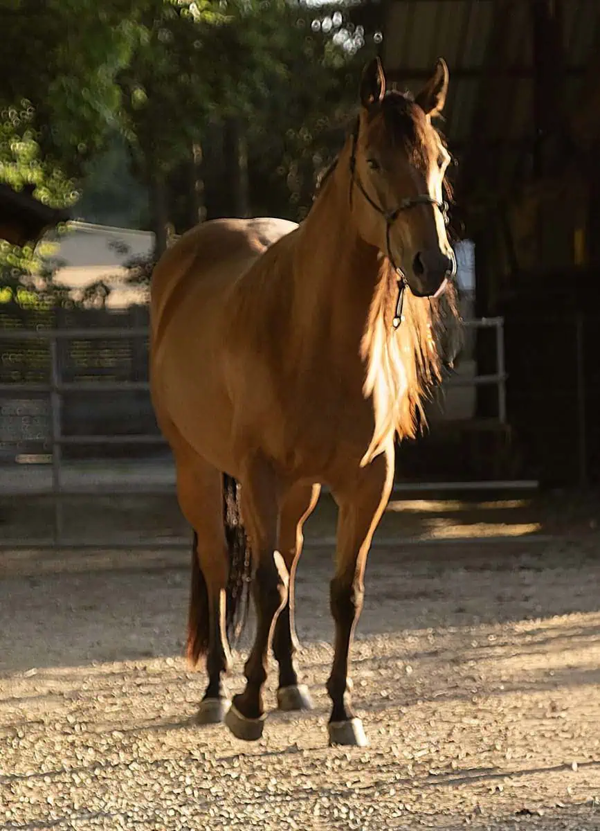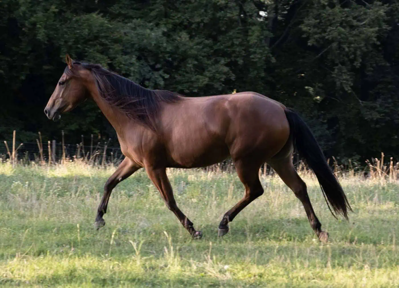 Ein wunderschönes braunes Pferd steht in der Abendsonne auf dem Biohof Schatz, ländliche Tierhaltung und Natur.